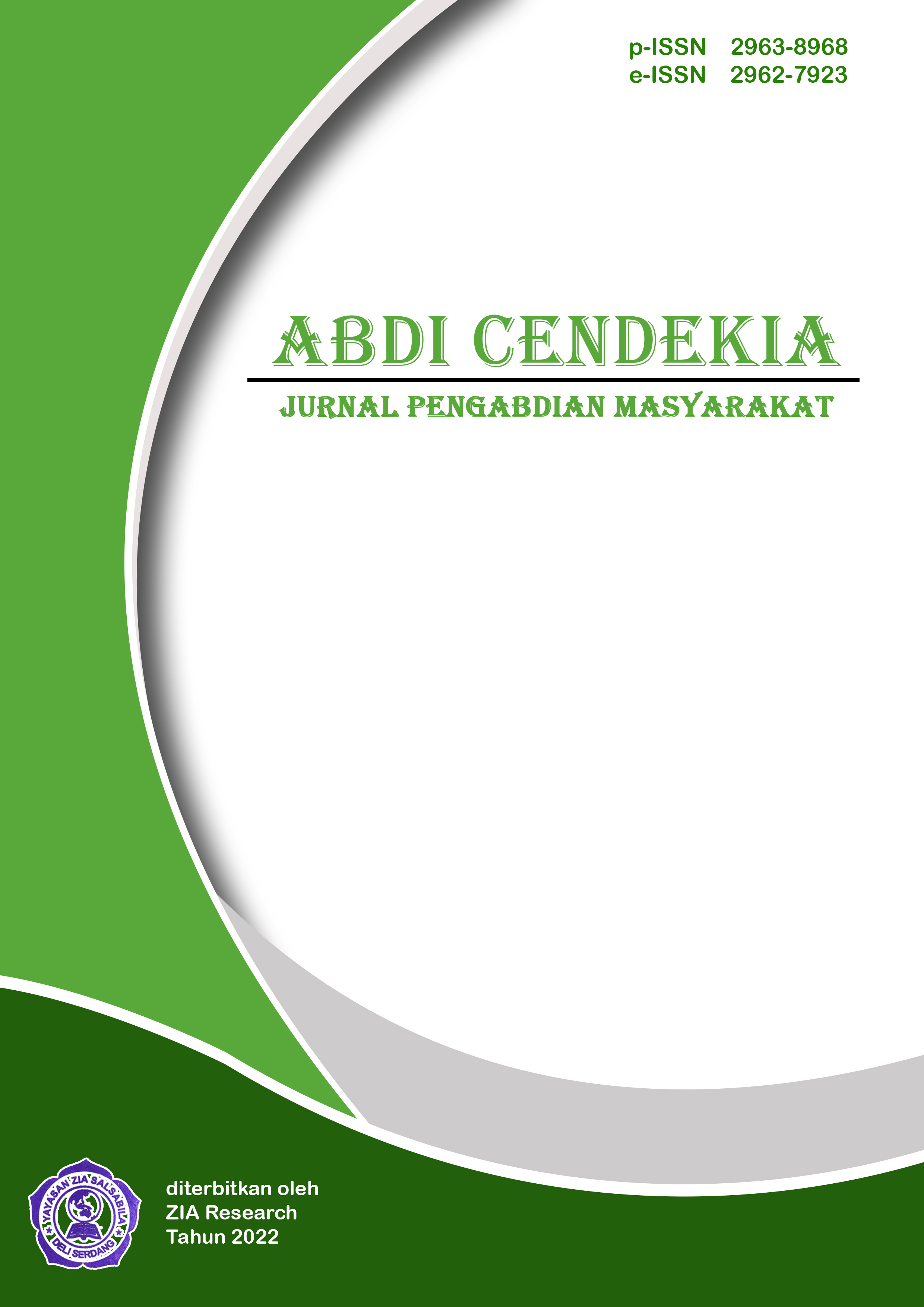 Abdi Cendekia: Jurnal Pengabdian Masyarakat has become a CrossRef Member since the year 2023. Therefore, all articles published by Abdi Cendekia: Jurnal Pengabdian Masyarakat will have unique DOI number 10.61253. Published by the Zia Research dan Publication Sub, under licensed Yayasan Zia Salsabila.Focus and Scope of Abdi Cendekia: Jurnal Pengabdian Masyarakat is the development of the creativity of the higher education community (lecturers and students) in the form of Real Work Lectures, Field Experience Practices, and other forms of community service activities.
