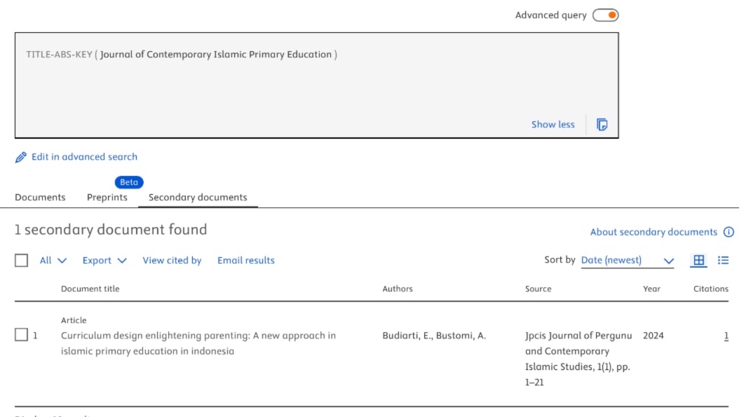 Furthermore, the following displays the image and access link for Citedness in SCOPUS, Journal of Contemporary Islamic Primary Education in the Document Search Column in Scopus.